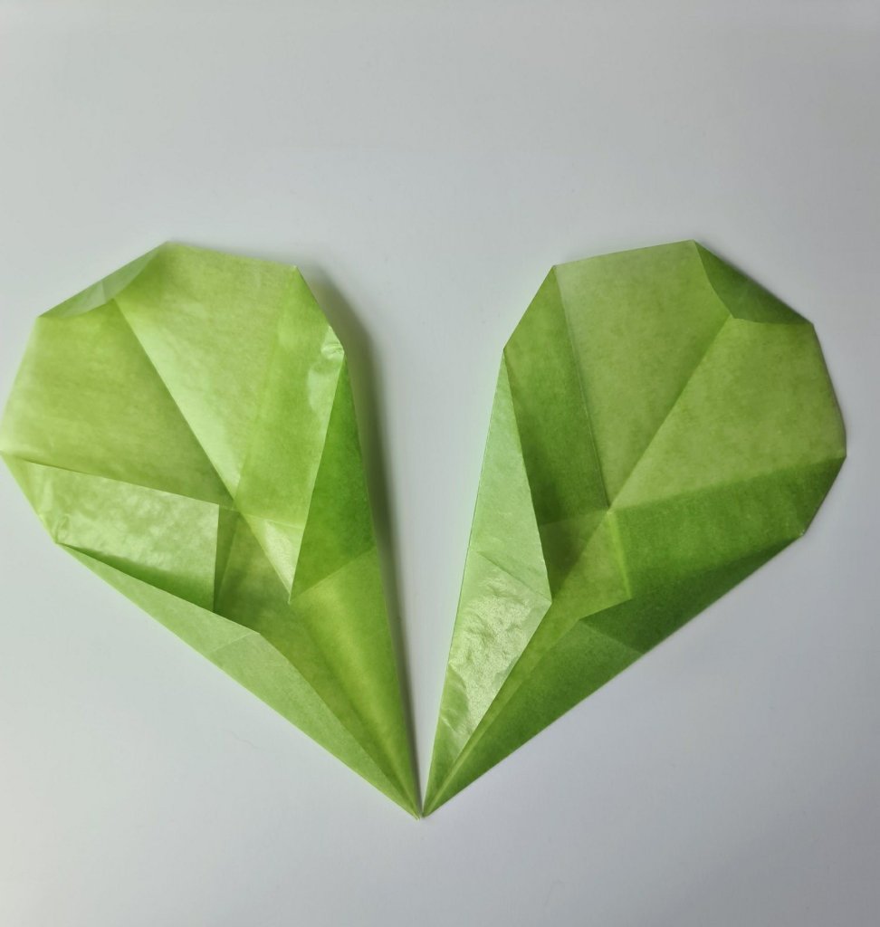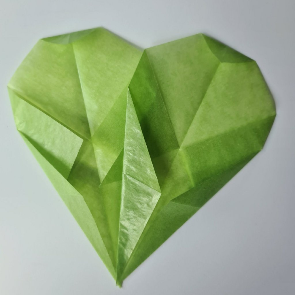 Then the final fold creates the heart shape. You simply fold the top corner down a little. The boys used their thumb as a guide, I won’t give a measurement because it’ll be different depending on what size paper you use!