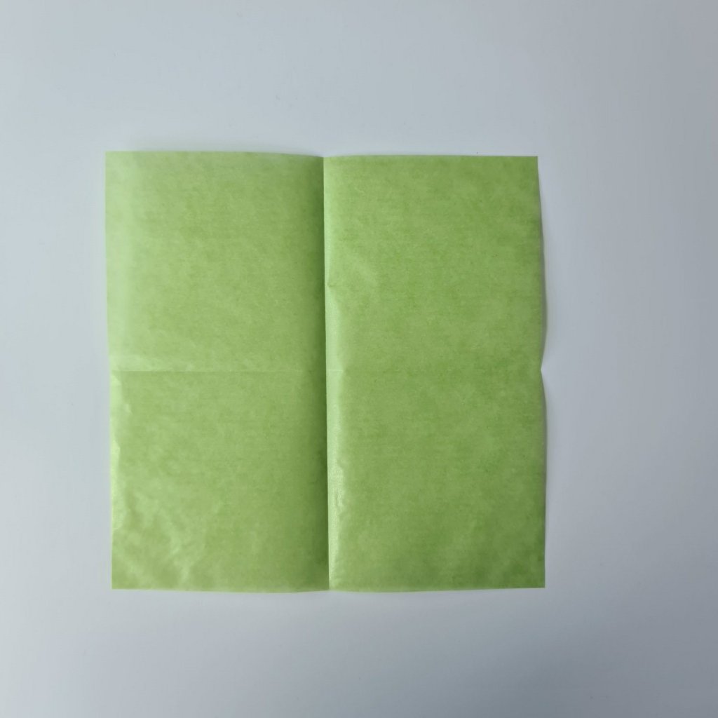 Fold your square in half and crease well. Then open it back up and turn the paper 90 degrees and fold, crease and open up again.